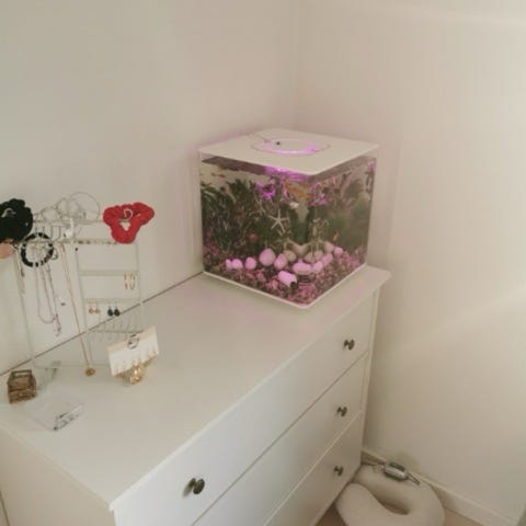 Akvarium med dæmpbar belysning, varmelegeme, lysstyring og mulighed for hvid piedestal. Pumpen er placeret indvendigt. Det er et meget let akvarie at have med at gøre. Piedestalen er hjemmebygget og er inkl. i pris. Nyprisen er 769 i Plantorama, men det er uden varmelegeme og lysstyring. Akvariet er cirka et år gammelt og i meget fin stand.