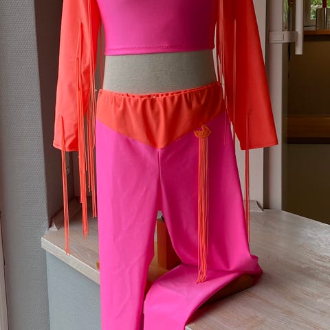 Januarudsalg. Discodragt, helt ny fra Discodragter.dk, str. 6-8 år ca., uden glimmer. Neonpink og primula gul lycra med spiralfrynser på ærmer. Der er blonde på top plus foran på bukselinning.