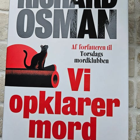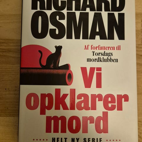 Richard Osman We Solve Murders bog. En trykt bog med hardback omslag, skrevet på engelsk. Indeholder en detektivhistorie med fokus på mordopklaring. Bogen har en prisetiket på 229,95 og sider med tekst i standard bogformat.