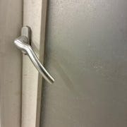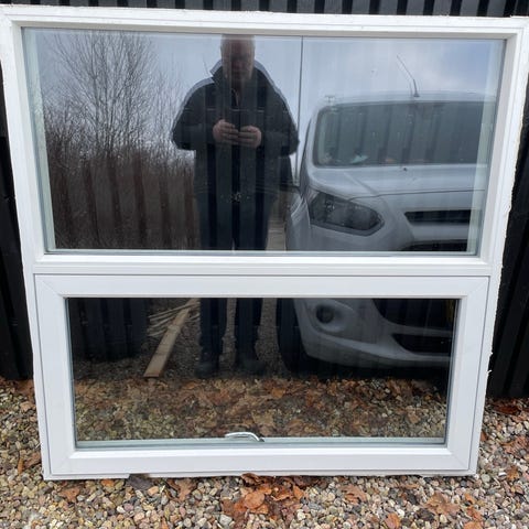 Plastvindue med fire ruder og hvid ramme. Taget ud i forbindelse med renovering.