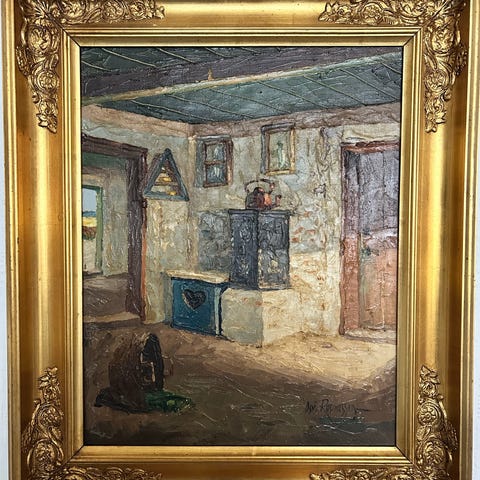 Maleri af et ruminteriør i en superflot ramme.
