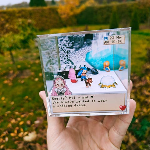 Håndlavet diorama på bestilling. Mål: 9x9 cm. Perfekt gaveide hvad enten det er til jul, fødselsdag eller en anden særlig begivenhed, så kan jeg forsikre, at disse er unikke og ikke noget den almene ikke kender til. Eller bare et cool og anderledes objekt til dit gamer-room måske? Der er ingen tvivl om, at disse bedst egner sig til hende eller ham, der i forvejen har alt ;-)