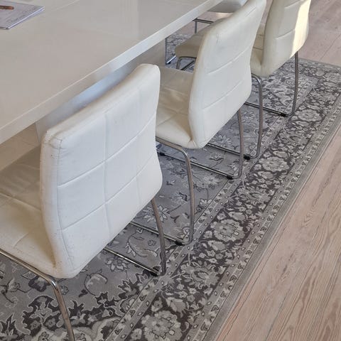Jysk stol med gråt stofbetræk og sort metalstel. Stolen har polstret sæde og ryg for komfort. Velegnet til brug ved spisebord eller som ekstra siddeplads.