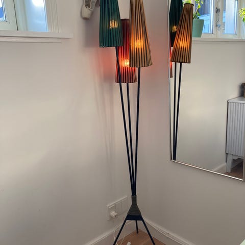 Skal hyggen have et nøk opad? Så er det rette valg denne smukke ældre standerlampe med sort plissé skærm og stel i træ. Lampens højde inkl. skærm er indstillelig fra ca. 134 til 174 cm og ledningslængden er ca. 215 cm, når lampen er i laveste højde. Afbryder er påmonteret på fatningen under lampeskærmen. Lyskilde: E27 (isiddende pære medfølger). Lampen fremstår med almindelige aldersrelaterede brugsspor.