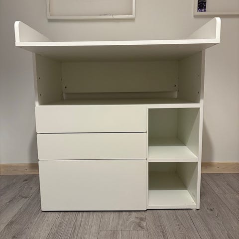 IKEA puslebord med opbevaringsplads. Bordplade og kanter i hvid, skuffer og hylder i lyst trælook. Designet til børneværelse med funktionel opbevaring af bleer, tøj og andre babyartikler. Bordpladen har enkelte brugsspor.