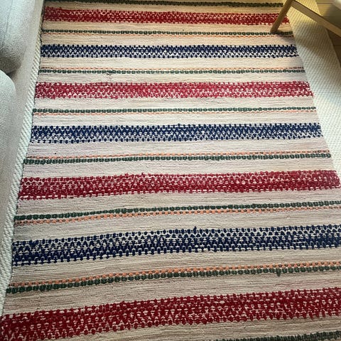 Super flot lille gulvtæppe i røde og naturfarvet striber. Helt nyt. Skal afhentes på Østerbro