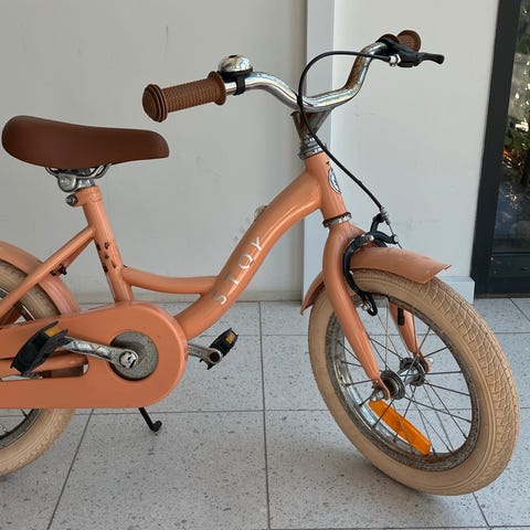 Stoy børnecykel med 14 tommer hjul i lyserød farve.