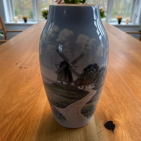Bing & Grøndahl vase med motiv af vindmølle og landskab 1302/6251. Den har en højde på cirka 18 cm.