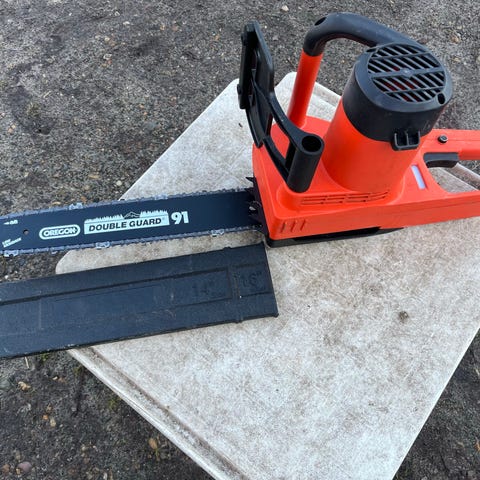 Husqvarna elektrisk motorsav med ledning og tilhørende orange beskyttelseshjelm med høreværn. Trænger tilmed ny kæde!