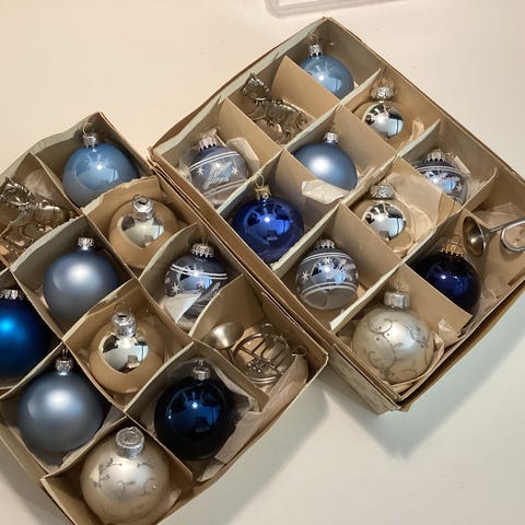 Retro og vintage julekugler, Flot julepynt i flot dyb blå og sølv. forskellig størrelse, materiale og alder, men disse 2 sæt er primært udført i glas. Der kan være aldersrelaterede brugsspor på nogle af delene og æsker følger ikke med. Jeg har 2 sæt der er næsten identiske, blot en smule forskel på de fine sølvstjerner