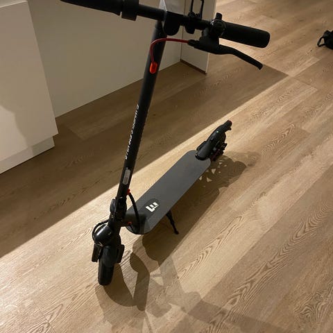 E - WHEELS E2S V2 LR Electric Scooter El-Scooter i sort farve. Udstyret med LED-display, der viser hastighed og batteristatus. Designet til personlig transport og pendling. det kører 30 km/t og 30 km på en opladning med punkterfri dæk
