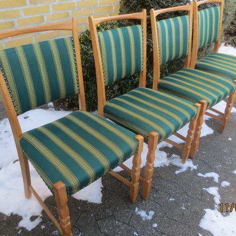 Henning Kjærnulf for Møbelfrakken Lindebjerg. 6 stk. spisestole i det smukkeste velbevarede egetræ fra 60’erne. De er i helt fantastisk stand alderen taget i betragtning (kun få brugsspor). De er mærket i bunden. Se foto.