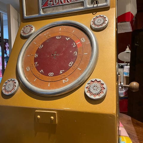 Er en gammel enarmet tyveknægt fra start 1970 erne, det er med klingende mønt i møntskålen ved hver gevinst uden tryk på nogen knap.