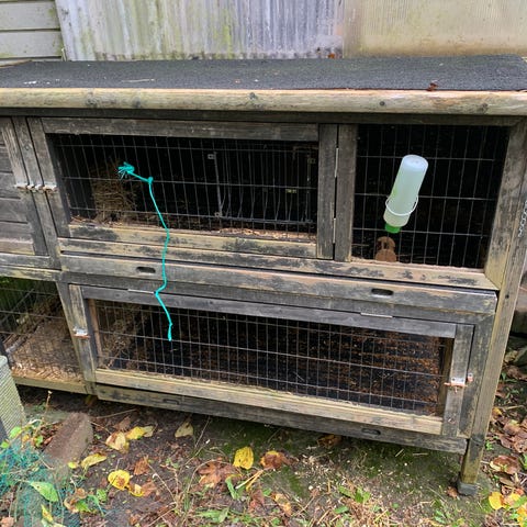 Flot udendørs bur i træ med tagpap på. Træet er olieret og kan modstå vind og vejr.