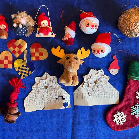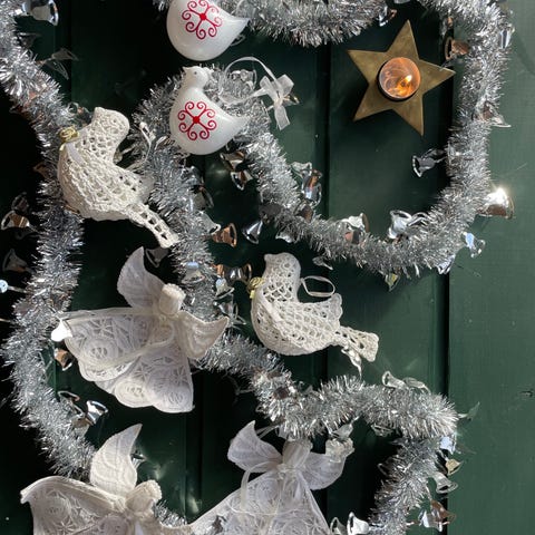 25 styk julepynt lavet i fjer fra Broste Copenhagen. Kugler, hjerter og juletræer.