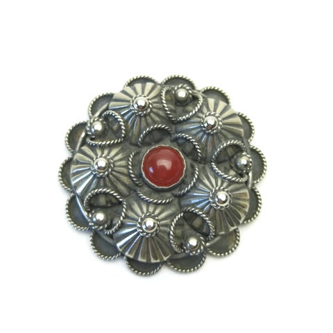 Elegant sølv broche med en stor ametyst sten i midten omringet af 5 mindre ametyst sten. Brochen har et gennembrud design stemplet 830S HF på bagsiden. Designeren hedder H. Fischer fra København og er fra start 1900. Brochen måler 5,4 cm i diameter og fremstår med brugs spor.