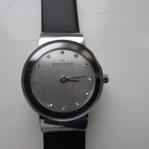 Skagen dameur uden rem, urskive i lys farve med sort kant og talmarkeringer.