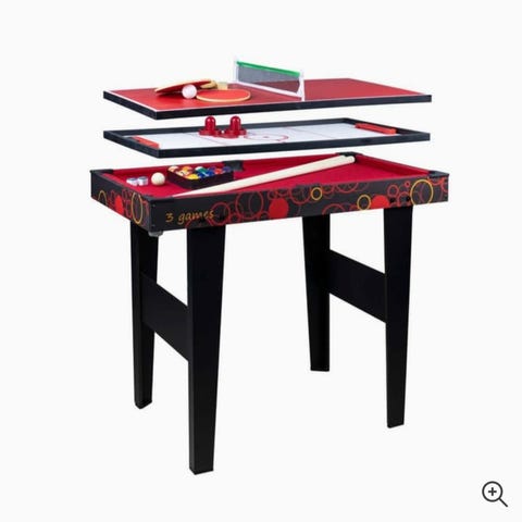 3-i-1 spillebord med “air”-hockey, bordtennis og billard på. 3-i-1-spillebordet er let at samle, og det er meget nemt at skifte spil.