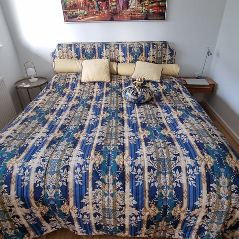 Flot og eksklusivt hovedgærde, sengetæppe og puder. Flot motiv. Som nyt.