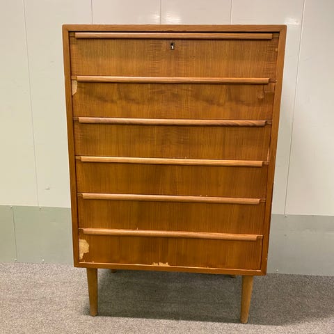 Lækker gammel retro kommode i taektræ fra 1960erne. Kommode med 6 skuffer. Skufferne kører rigtigt godt. Fremstår i pæn stand. Evt kan lev aftales.
