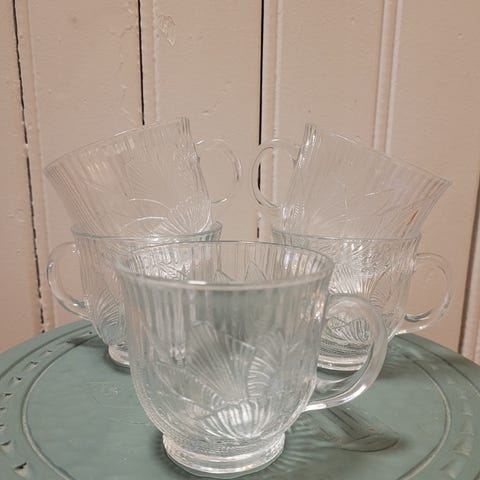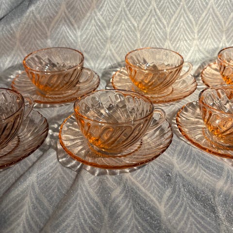 6 fine kopper af rosa glas med swirl fra franske Arcoroc. 50 kr. per sæt.
