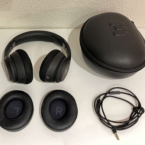 justerbart headband, med over-ear ørepuder, som omringer øret og lukker alt støj fra omverdenen ude.