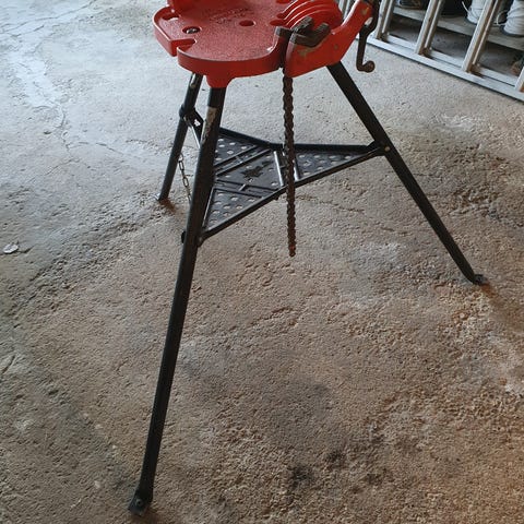Rørbænk fra Ridgid. De foldbare ben gør den nem at transportere og opstille. Den har en fod, der går ud over de forreste ben, så der er plads til værktøjets drejning.
