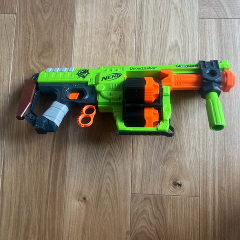 X-shot Excel Crusher, minigun med patronbælte og ekstra patroner.