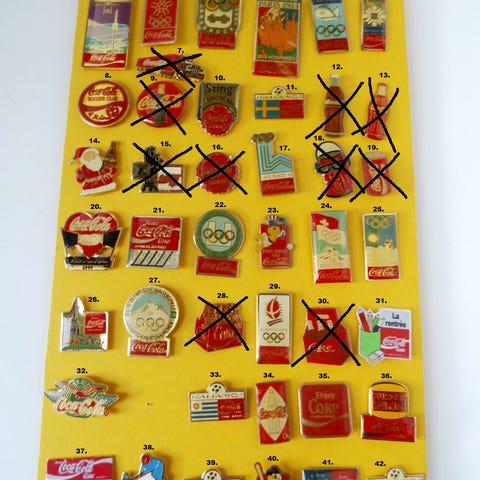 Coca-Cola emalje pins med motiv af bjørn. Pinsene har en bagplade med låsemekanisme til fastgørelse. Farverne inkluderer rød, brun og grøn. Pinsene er små accessories, der kan bruges til beklædning eller tasker.