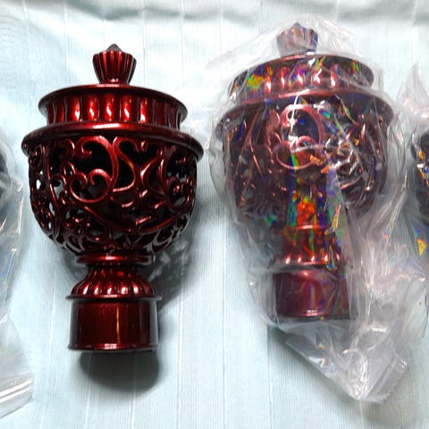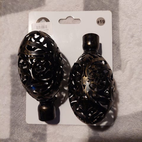 Vi har 4 ubrugte flotte plast gardinstangs ende stykker i mahogni farve, som også kan bruges til håndarbejde, f.eks at skabe nogen kunstgenstand. Sælges sammen KUN for kontanter