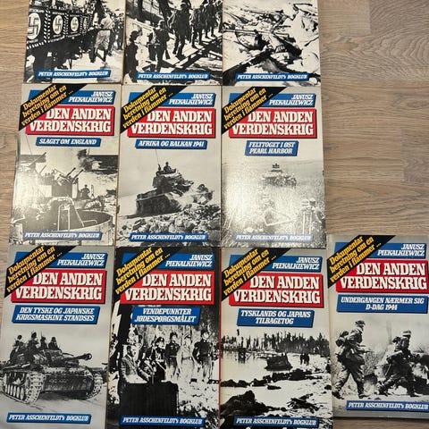 A: "Anden Verdenskrig" 10 bind á 260 sider. Janusz Piekalkiewicz. Foto 5372. Pris. 400 kr. for alle 10 bind.