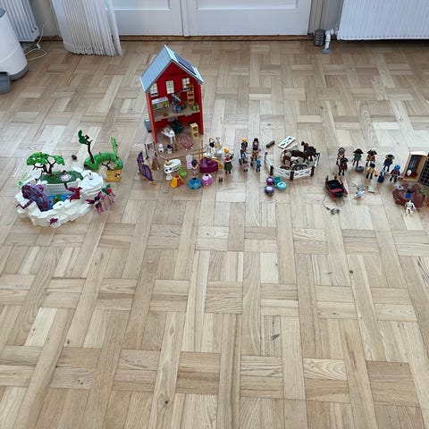 - Dertil en masse playmobilfigurer (personer og dyr) i forskellig alder og kvalitet, samt en masse udstyr der er sjove at lege med (indhegning, våben, redskaber, service, rustning, kongestol, musikinstrumenter, trillebør mv).