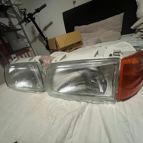 Volkswagen forlygter sæt til bil. Sættet indeholder to forlygter med tilhørende ledningsforbindelser. Designet til specifik montering på Volkswagen-modeller.