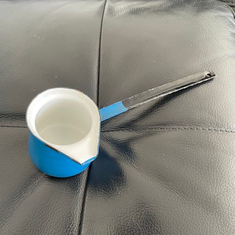 Emaljeret kande med en kapacitet på 1000 ml. Kanden har måleangivelse indvendigt og er hvid med blå kant. Materialet er emalje, hvilket gør den egnet til opbevaring og måling af væsker.