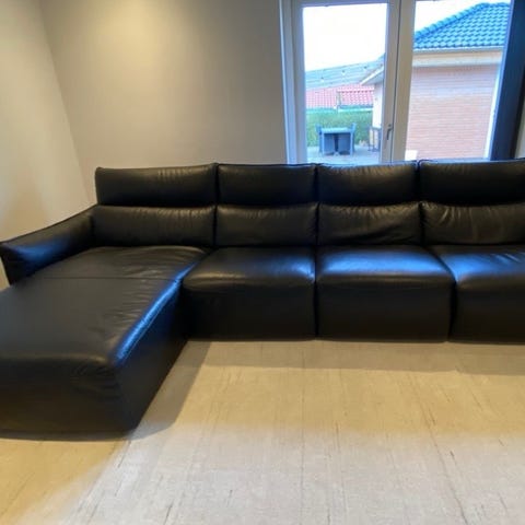 Sofaen har en moderne, minimalistisk stil med sorte læderpolstret sæder og stel ag egetræ. Yderst velholdt. Nypris 15.000kr. Kvittering medfølger.,Afhentes i:,Røde Kors Tuborgvej / København NV (101),Bemærk at mail, chat og beskeder ikke besvares, og varen skal købes på knappen "Gå til varen"