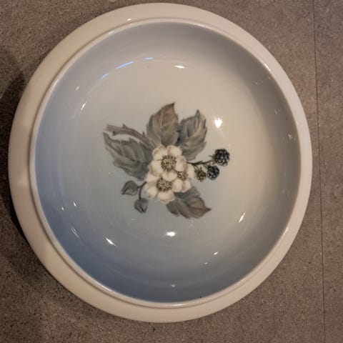 Skålen er med blomsterdesign. Den er rund