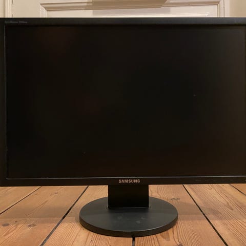 Samsung SyncMaster 24" skærm med HDMI-forbindelse. AOC E2470SWH 24" skærm med HDMI og D-SUB tilslutninger. Begge skærme har en skærmstørrelse på 24 tommer.