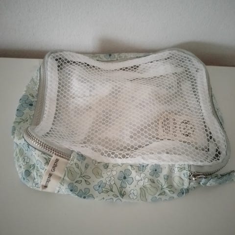 Let og pæn toilettaske med lynlås og ét stort rum indeni fra Lene Bjerre. Købt i 90’erne og brugt sparsomt, så den er i rigtig god stand. Den er matsort med hvide striber (farven forsøgt fanget på de sidste 2-3 billeder).