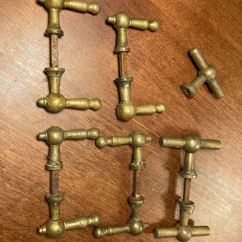 Rigtig flot gammelt massive messing greb med rosetter, cylinderring og vrider, med masser af patina. Skriv gerne for mere info. Vil gerne sende med GLS.