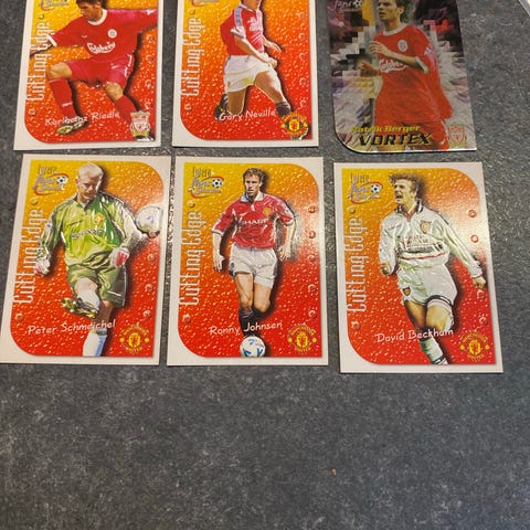 Samling af fodboldkort med forskellige spillere og klubber. Kortene varierer i design, farve og spillere, og kan bruges til samling eller bytte.