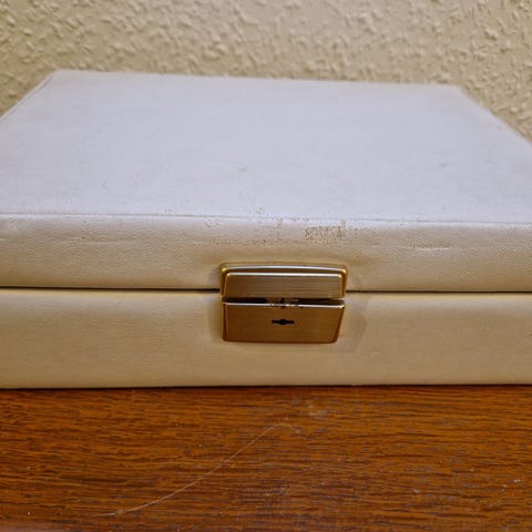 Hvid træ smykkeskrin med spejl, og sort veluer stof indvendig