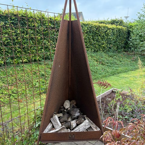 Udepejs i sort med tilhørende grillrist. Designet til udendørs brug,