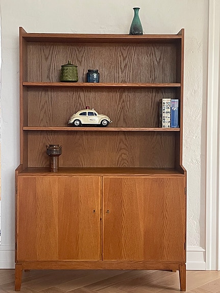 Små skuffer og skab øverst og 3 store skuffer forneden.