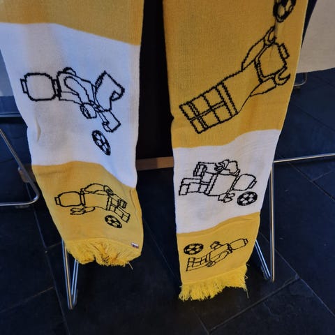 Ubrudt. 157 cm x 18 cm. Gul/hvid med sorte tegninger af fodboldspillende figurer. 95% akryl, 5% elastan.