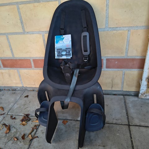 Front sæde. Let montering med beslag på styrpinden. Justerbar ben- og selelængde.