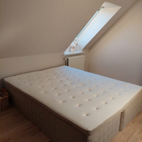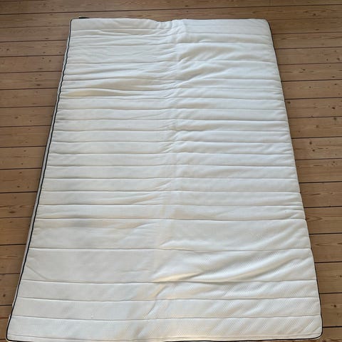 Topmadras i memory foam, mærke ukendt. Betræk kan tages af og vaskes. Standen er rimelig med et enkelt lille hul i betrækket. Fra røgfrit hjem.
