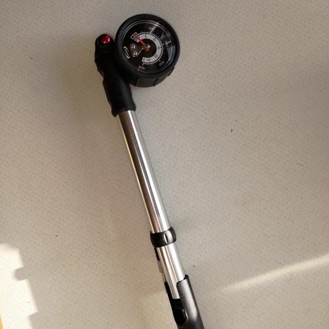 SKS Airchecker manometer til cykeldæk med håndtag i blå farve og sølvfarvet krop. Designet til at måle lufttryk i cykeldæk præcist.