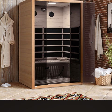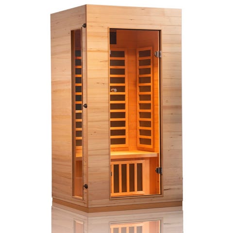 IR sauna i topkvalitet, 91,3 x 91,3 x 193,8 cm. Med 6 pure infra carbon paneler samt gulv og sæde varmeplade.