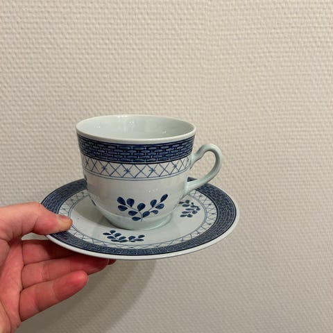 Royal Copenhagen kaffekop med tilhørende underkop Tranquebar. Sættet består af kopper og underkopper med klassisk blå dekoration på hvid baggrund.