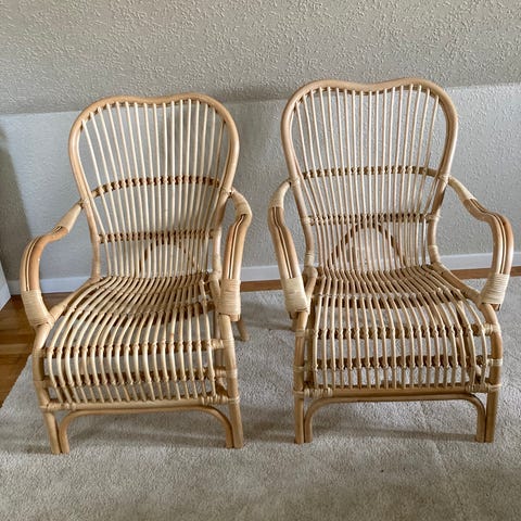 Smuk og velholdt Liseleje stol fra Jysk, i naturfarvet rattan og med en let og nordisk stil. Stolen er købt samlet og fremstår i rigtig pæn stand – der medfølger både originalt mærke/skilt samt de originale skånepuder til benene.